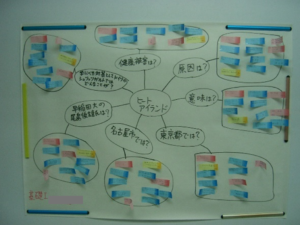 ゼミ生みんなにとって、マインドマップは初めての経験だそうでした。最初は、ややためらいもあったようですが、次第に慣れてきて全員が楽しそうに取り組んでくれました。そして、御覧のとおり予想した以上にたくさんの付箋を貼り付けてくれました。