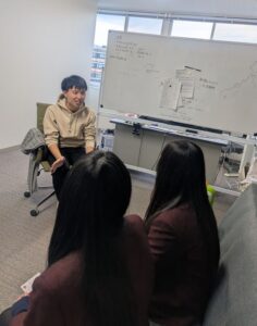 各グループは3つの個人研究室をハシゴしながら、大学の学修は何が異なるのか?経済学を学ぶと何に役立つのか?卒業研究はどのようなテーマがあるのか?などについて、順番に話を聞きました。