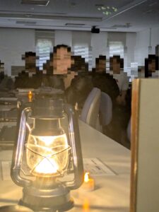 部屋を暗くして、電気ランプや電気ろうそくの明かりのみで怪談がはじまりました…