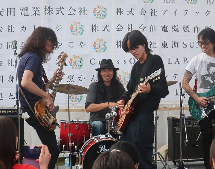 11月8日(土)のステージでは本学軽音楽部の学生と犬山市出身の兄弟ミュージシャン 満園庄太郎さん・満園英二さん(ともに本学付属市邨幼稚園出身)と、原田喧太さんによるバンド「KATAMALI」とのセッションもあり会場を盛り上げました。