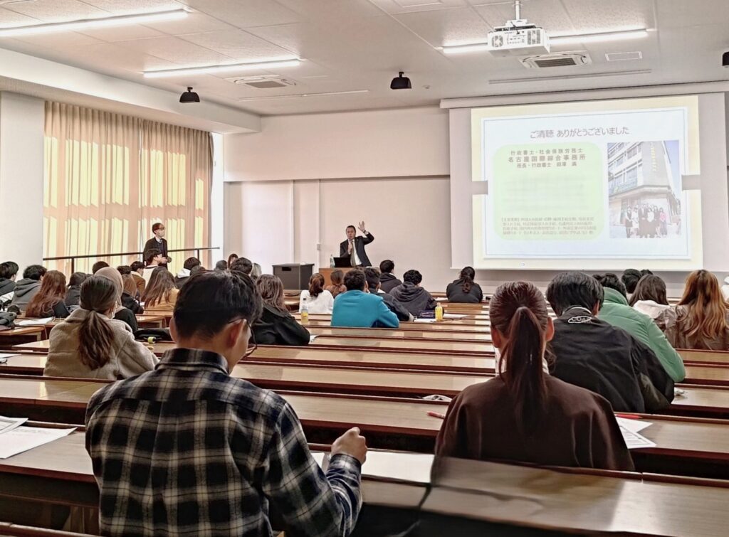 2025年12月1日(月)、本学が提供するキャリア教育の1つ「市民生活とキャリア形成(学部1年次以上)」において、外国人留学生(全学年)を対象とした「在留資格」等に関する最新情報やその内容を理解するため、行政書士の田澤 満氏(行政書士・社会保険労務士 名古屋国際綜合事務所所長)にご登壇いただきました。