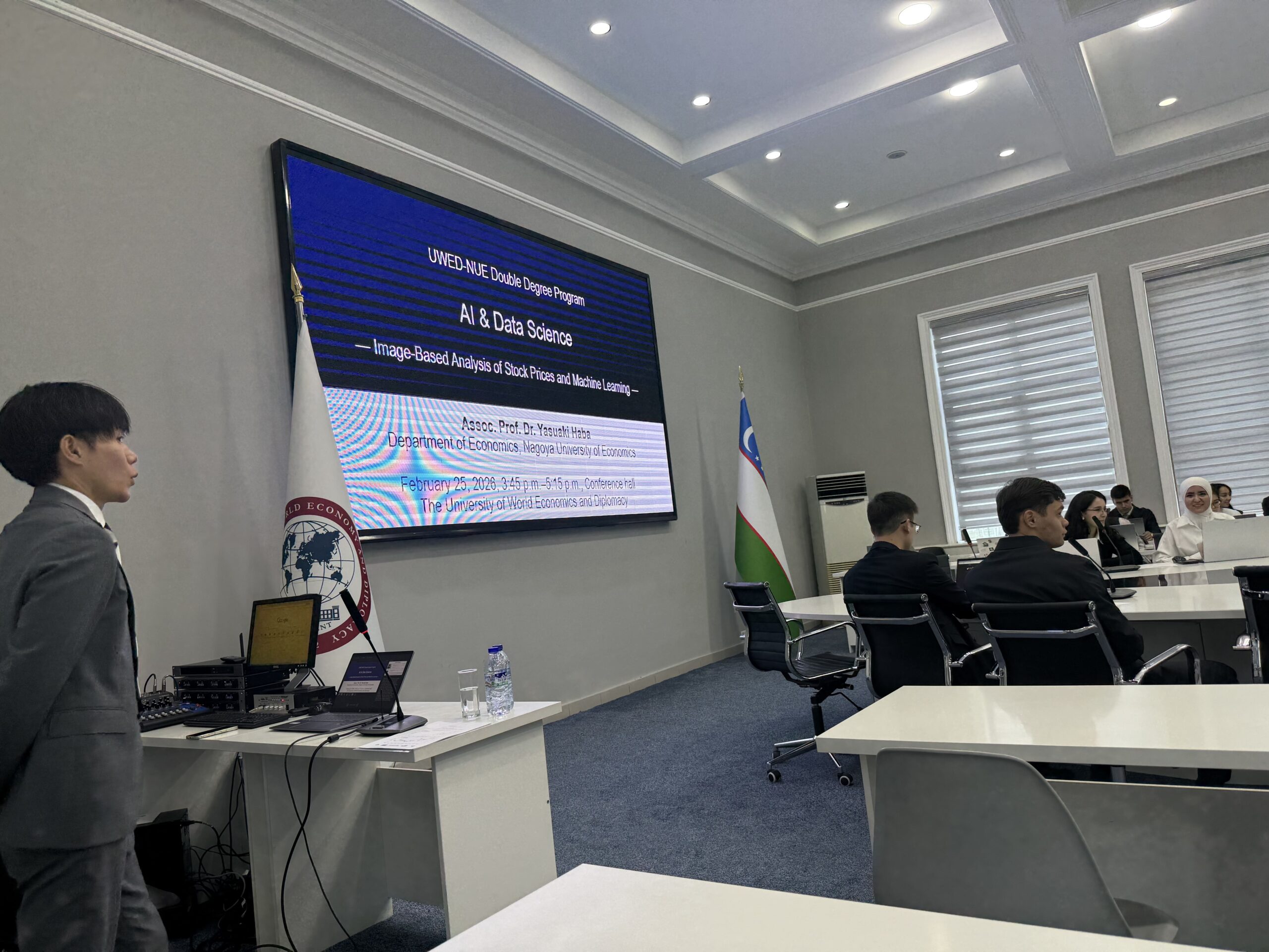 2026年2月25日、名古屋経済大学とのダブルディグリープログラムが締結されているウズベキスタンの世界経済外交大学(UWED: The University of World Economy and Diplomacy)において、AI & Data Science — Image-Based Analysis of Stock Prices and Machine Learning — という主題で、英語での授業を行いました。