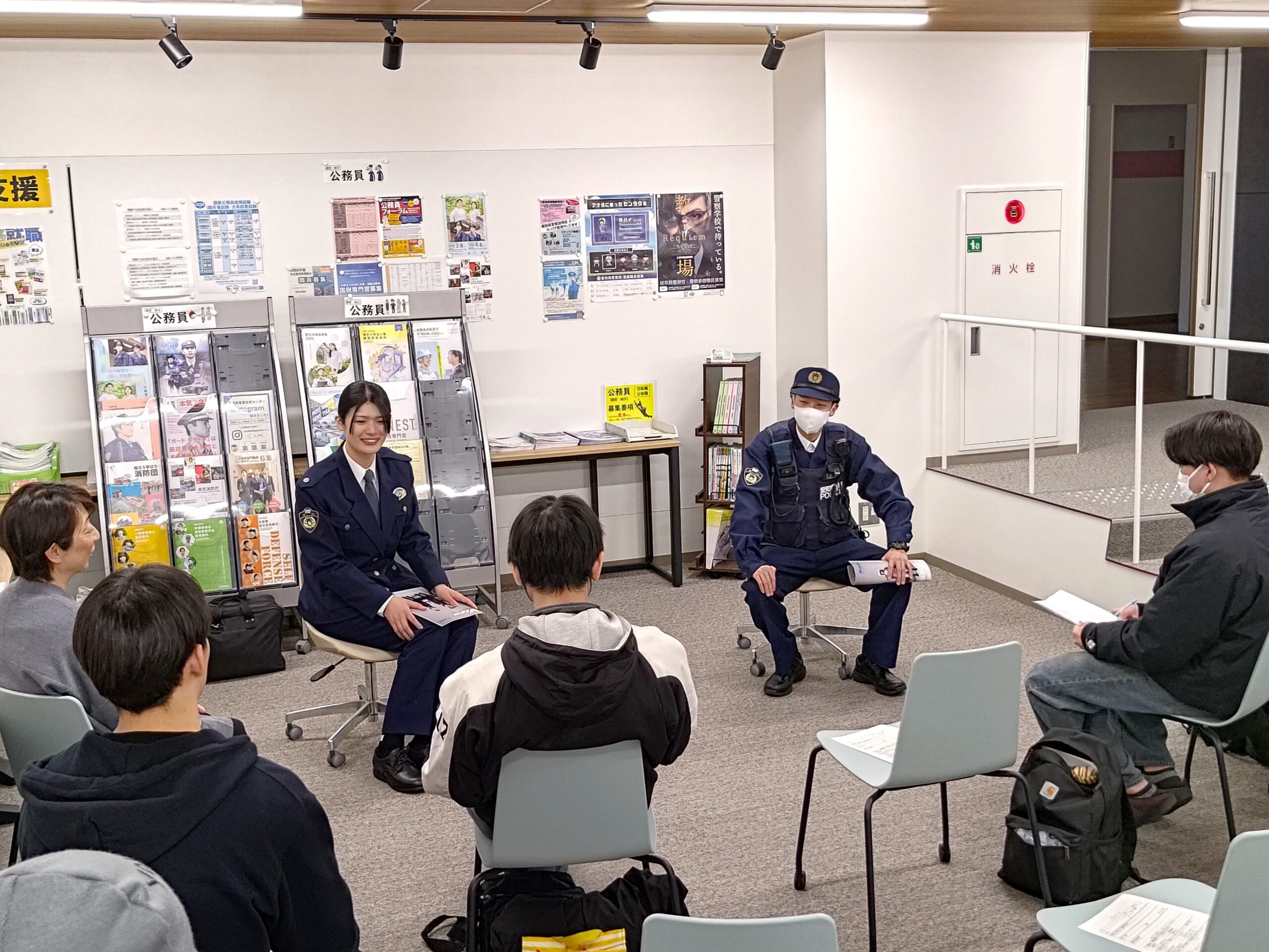 座談会では、これから挑戦する採用試験に関する疑問や、警察学校での生活、配属後の苦労ややりがいなど、参加学生から積極的な質問が寄せられました。卒業生のお二人は、受験時の経験談や現場でのエピソードを交えながら、丁寧に回答してくださいました。