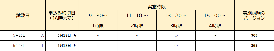 ・各時間、定員になり次第締め切ります。実施時限欄の○印が申込可能な時間帯です。 ・公開されている日程以外の試験日については、随時更新いたします。