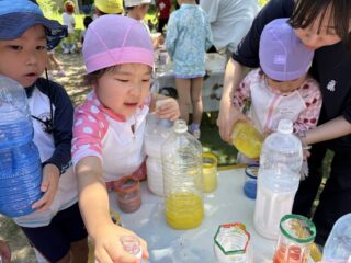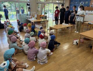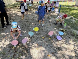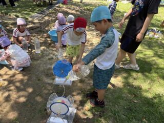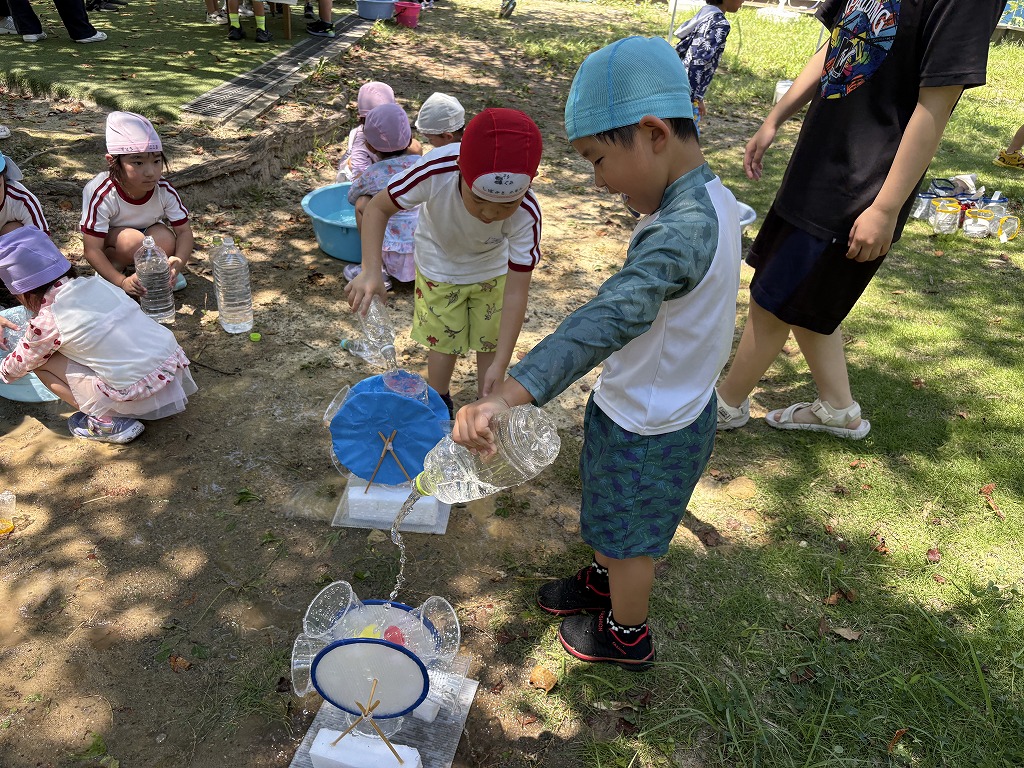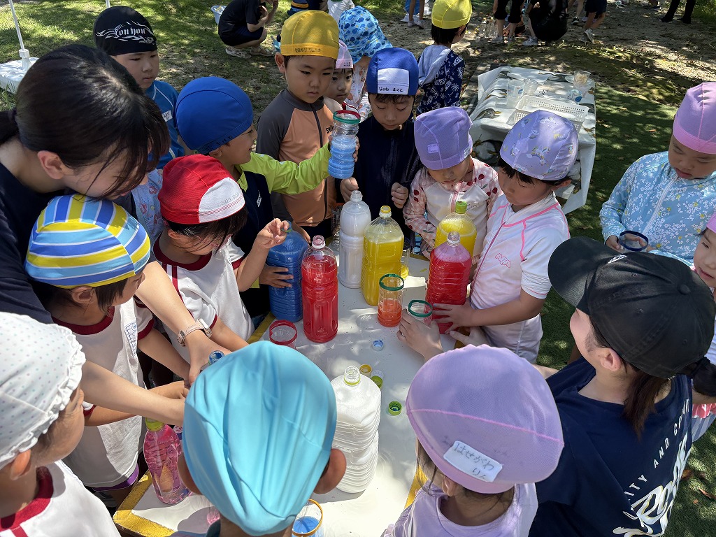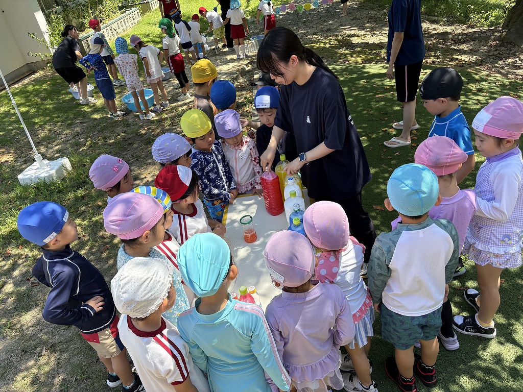 教育保育学科の大学生のお兄さんお姉さんが、年長組さんにいろいろな水遊びを用意してくれました。