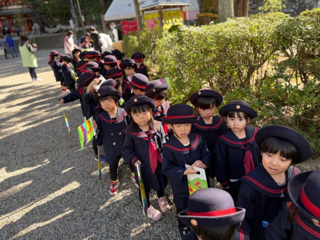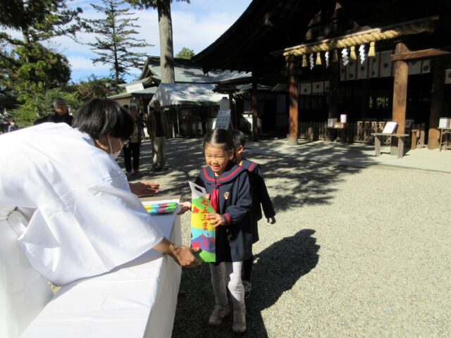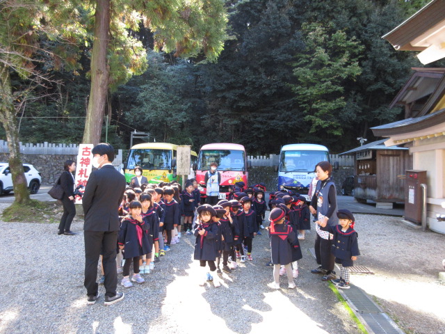 今年度は年少さん、年中さん、年長さんみんなで七五三のお宮参りに行き、子どもたち一人ひとりの成長を願って手を合わせました。