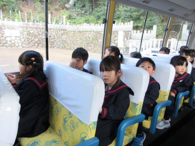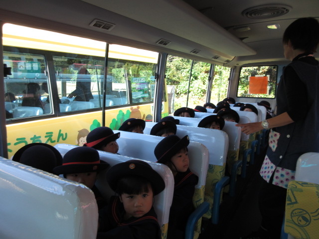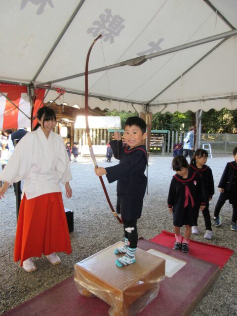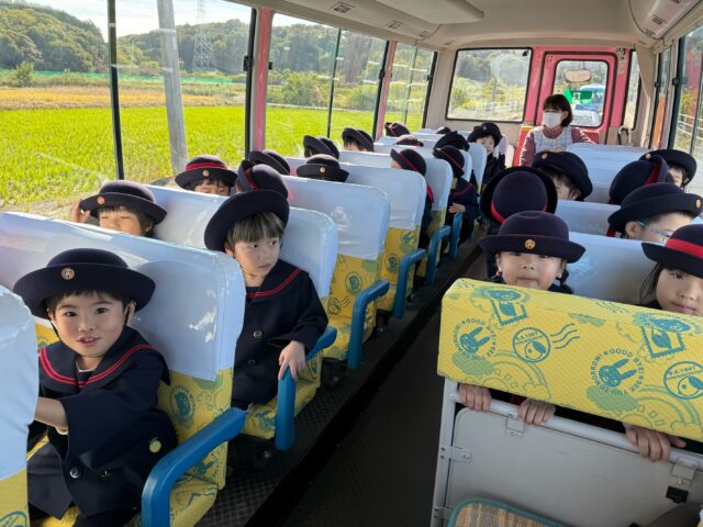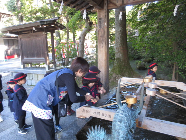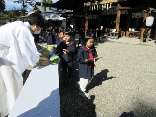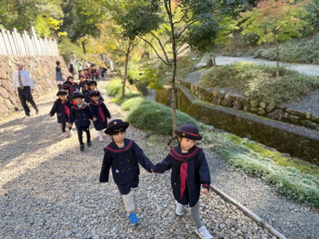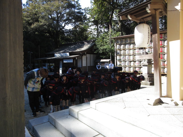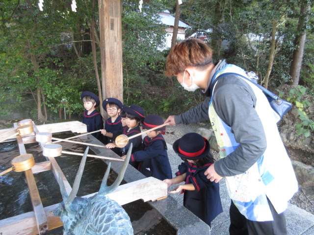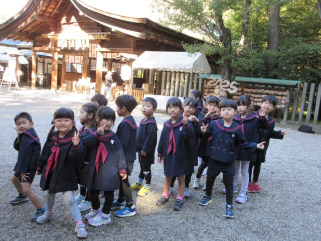 年中さんと年少さんは手を繋いで境内をお散歩しました。色づいた木々を眺めながら歩く子どもたちの姿がとてもかわいらしく、神社では二礼二拍手一礼をして参拝しました