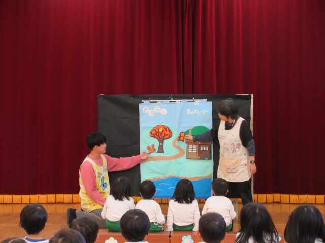 先生からのお楽しみはタペストリーシアター「さるかに合戦」でした。最後のシーンで、臼が猿の上に落ちて、猿をやっつけた時には、大笑いの子どもたちでした。
