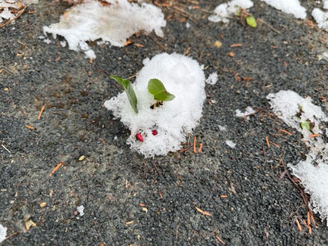 園庭に残った雪に子供たちは大喜び。冷たい雪の感触を確かめながら、雪を集めたり、丸めたりして楽しみました。