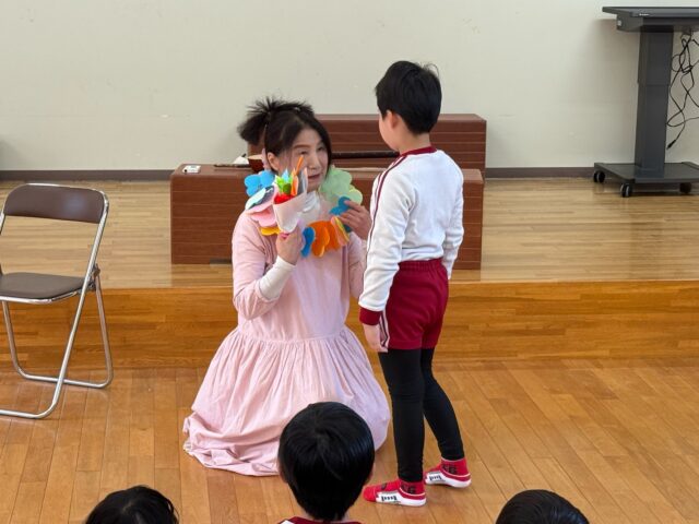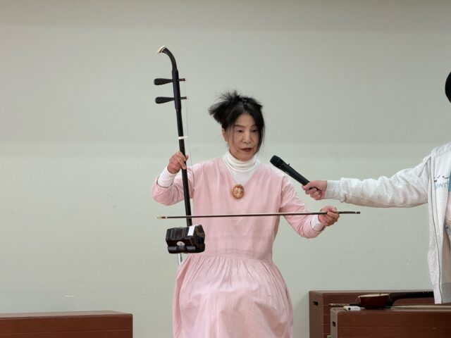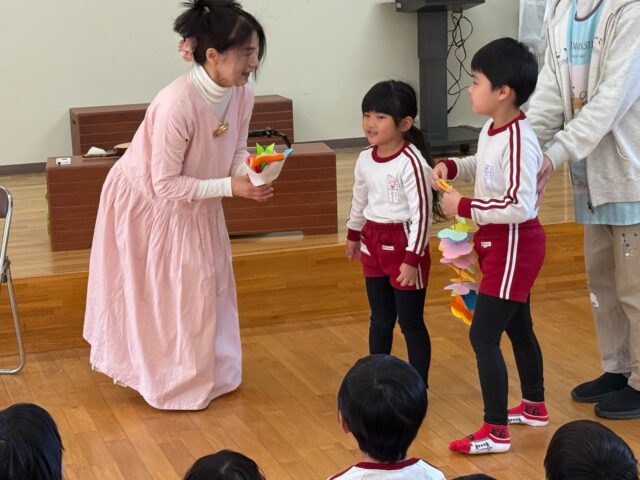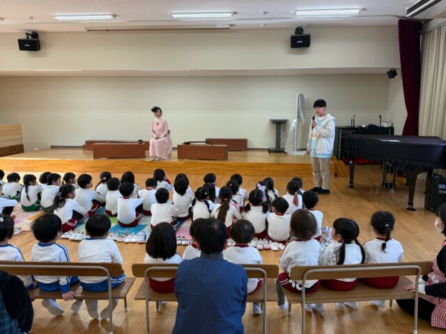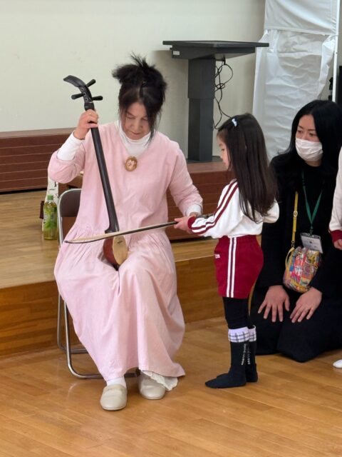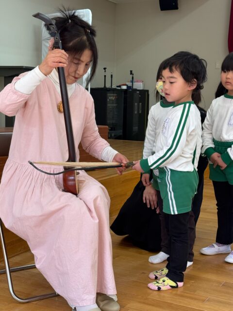 今回の音楽鑑賞会は二胡と胡弓の演奏を聴きました。演奏の後、年中・年長組の子どもたちは順番に胡弓を触らせていただきました。